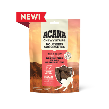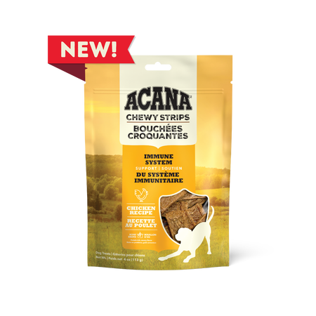 Delight your dog with the savoury flavour of ACANA™ Chewy Strips! Crafted with 4 key ingredients, including delicious, protein-rich chicken and antioxidant-rich cranberries, you can feel good about treating your dog. Every strip also helps support your dog’s immune system, with Vitamin E and antioxidant-rich cranberries. Bone broth adds a burst of flavour, and sweet honey gives Chewy Strips a texture dogs love. It’s the perfect snack for moments you want to treat your dog while helping to support their wellbeing!