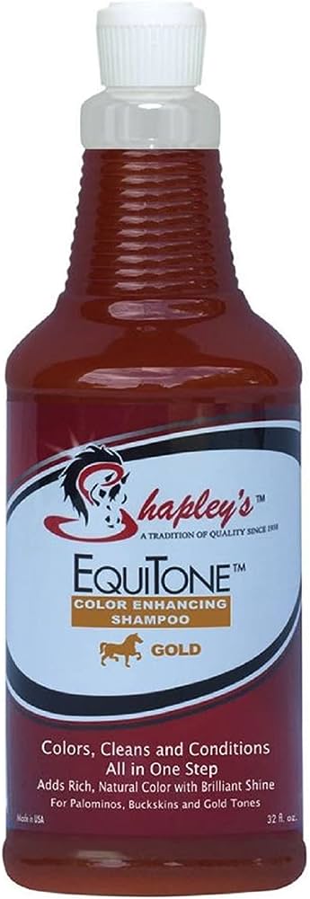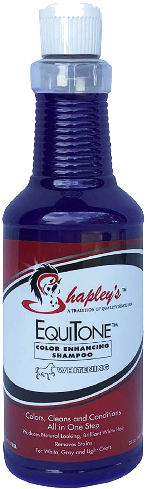 Shapley’s™ EquiTone "Colour Enhancing Shampoo" For Horses & other Farm Animals...great for Dogs too! Shapley's formula is a single step process that adds rich, brilliant color as it cleans and conditions! Adds vibrancy and vitality Natural looking, rich color with brilliant shine Smoother, silkier, shinier hair Rejuvenates sun damaged hair Rich foamy lather Rinses easily Saves time and money Complements Shapley's "Show Touch-up" color enhancing sprays #0708 - White #0705 - Black #0706 - Gold #0707 - Red Choose your Color: BLACK for blacks and Bays WHITENING for Grays & White manes & tails GOLD for Palominos and Buckskins RED for Chestnuts, Sorrels & Browns Available in 473mL