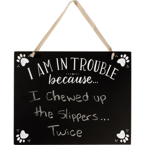 A wooden hanging décor piece featuring paw print designs and "I Am In Trouble Because..." sentiment, with space to finish the sentence with chalk (not included). Perfect for capturing funny pet memories. Easily hangs by cotton tape loop.