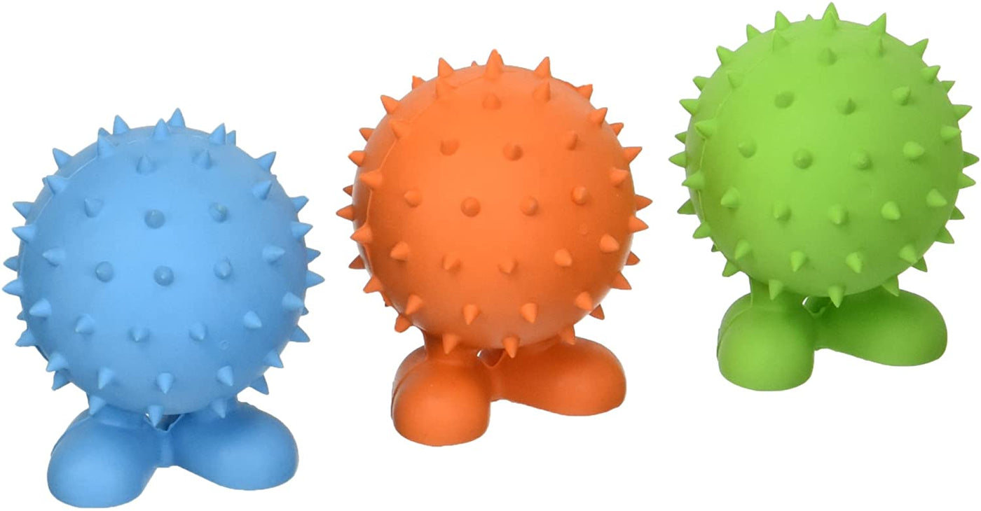 A JW® Spiky Cuz® will provide your dog with hours of non-stop erratic, bouncy fun! Manufactured using a non-toxic natural rubber that is great for rough play. This rubber ball with feet has a tough squeaker and an erratic bounce to keep your pet entertained. The raised spikes add texture, and can even help clean teeth and massage gums. Pet parents choose from an assortment of sizes. Ships in random fun assorted colors.