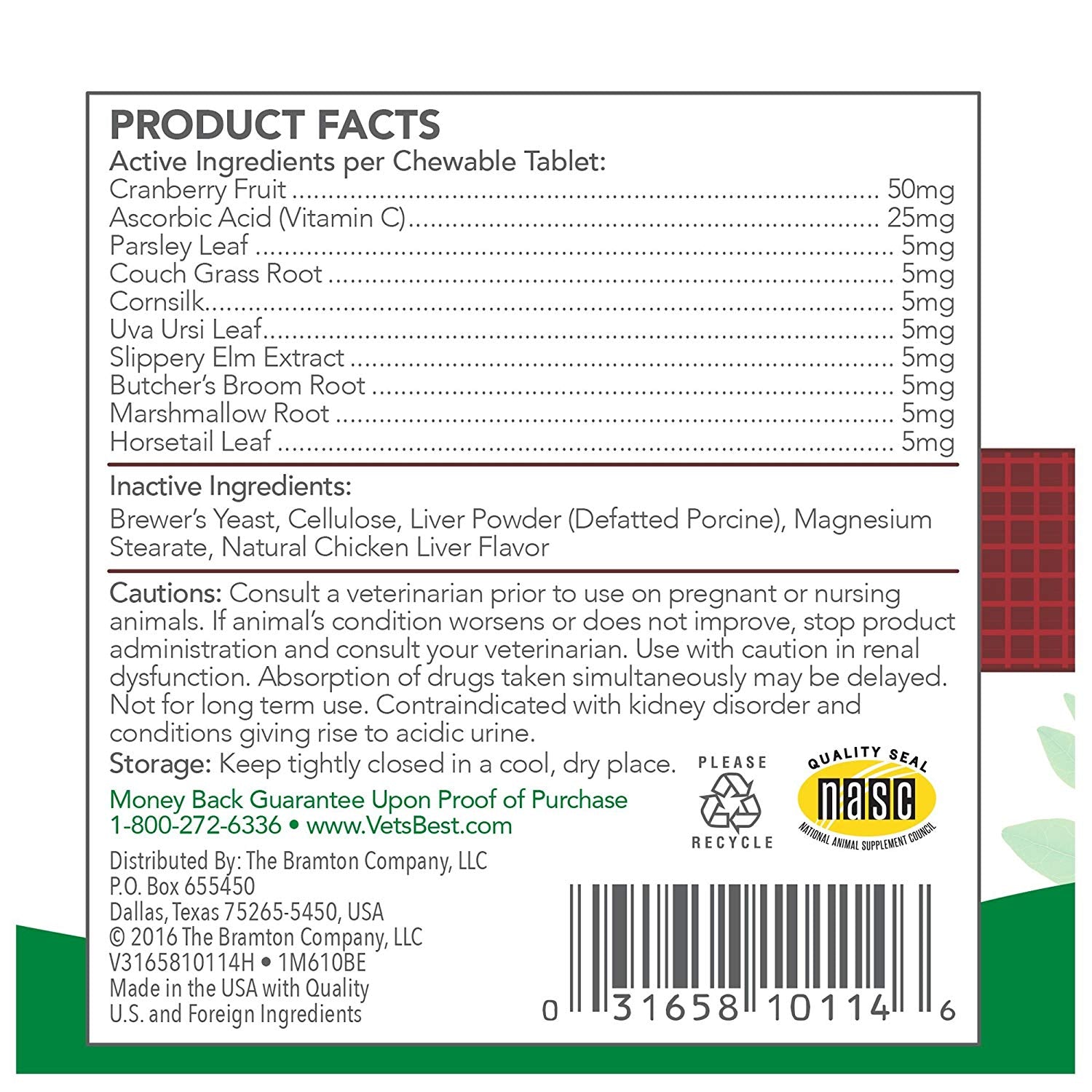 Vet's Best Feline Urinary Tract Support helps to support a normal, healthy tract function in cats. Feline Urinary Tract Support uses key natural ingredients (cranberry, parsley, and horsetail) to maintain healthy acidic and free-flowing level.  For best results, break tablets into smaller pieces to release ingredients and flavor, and give cat one or two tablets daily.